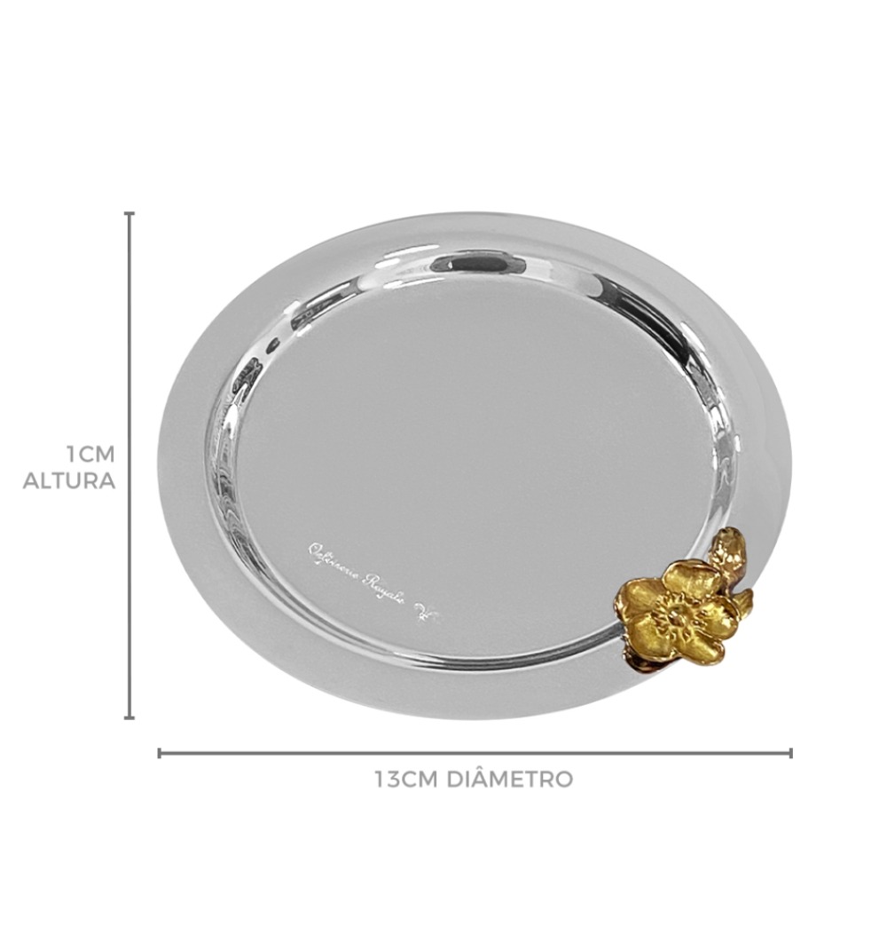 Bandeja inox redonda com flor dourada Orfevrerie Royale